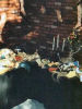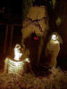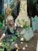 A 20ft x 12ft graveyard scrim (eerie full moon sky with silhouette trees and grave markers) serves as a backdrop. A floor tarp is dropped and covered with grass mats and bark mulch. Two crypt-like tombstones are placed at each end of the display. Two large tombstones flank a mound of earth (freshly dug grave) with a smaller tombstone header. A zombie hand and mask is protruding from the mound. A gravedigger mannequin stands next to one of the tombstones. Two spooky trees, spider webs, rubber crows and rats accent the setting. The display is fronted by several 10ft sections of weathered white picket fencing.